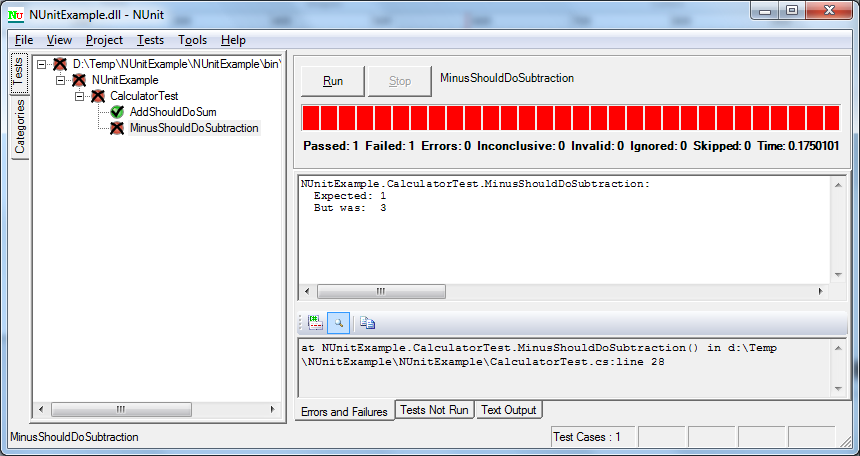 Di bawah adalah contoh apa bila ia dilarikan menggunakan GUI NUnit runner. Kita dapat lihat bahawa test untuk fungsi Add() berjaya, tetapi test untuk Minus() gagal kerana terdapat kesilapan dalam code kita.